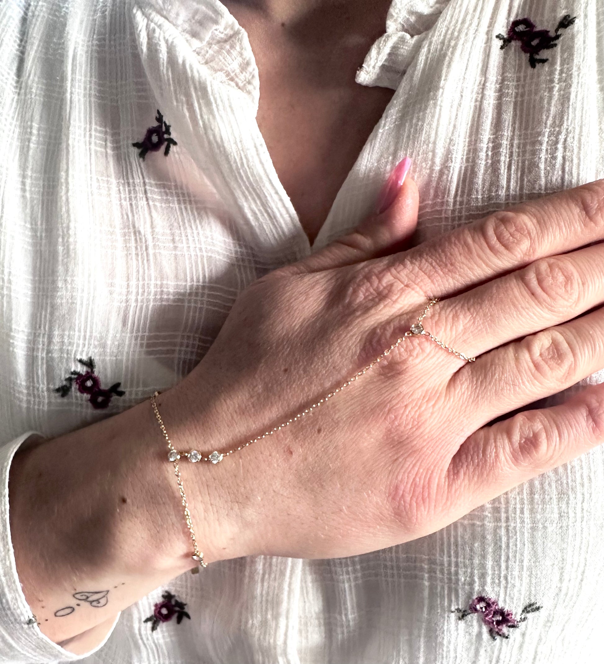 Bracelet bague en chaîne relié par fine chaîne deliquate orné de trois strass scintillants au niveau du poignet avec un strass central sur la bague en acier inoxydable doré