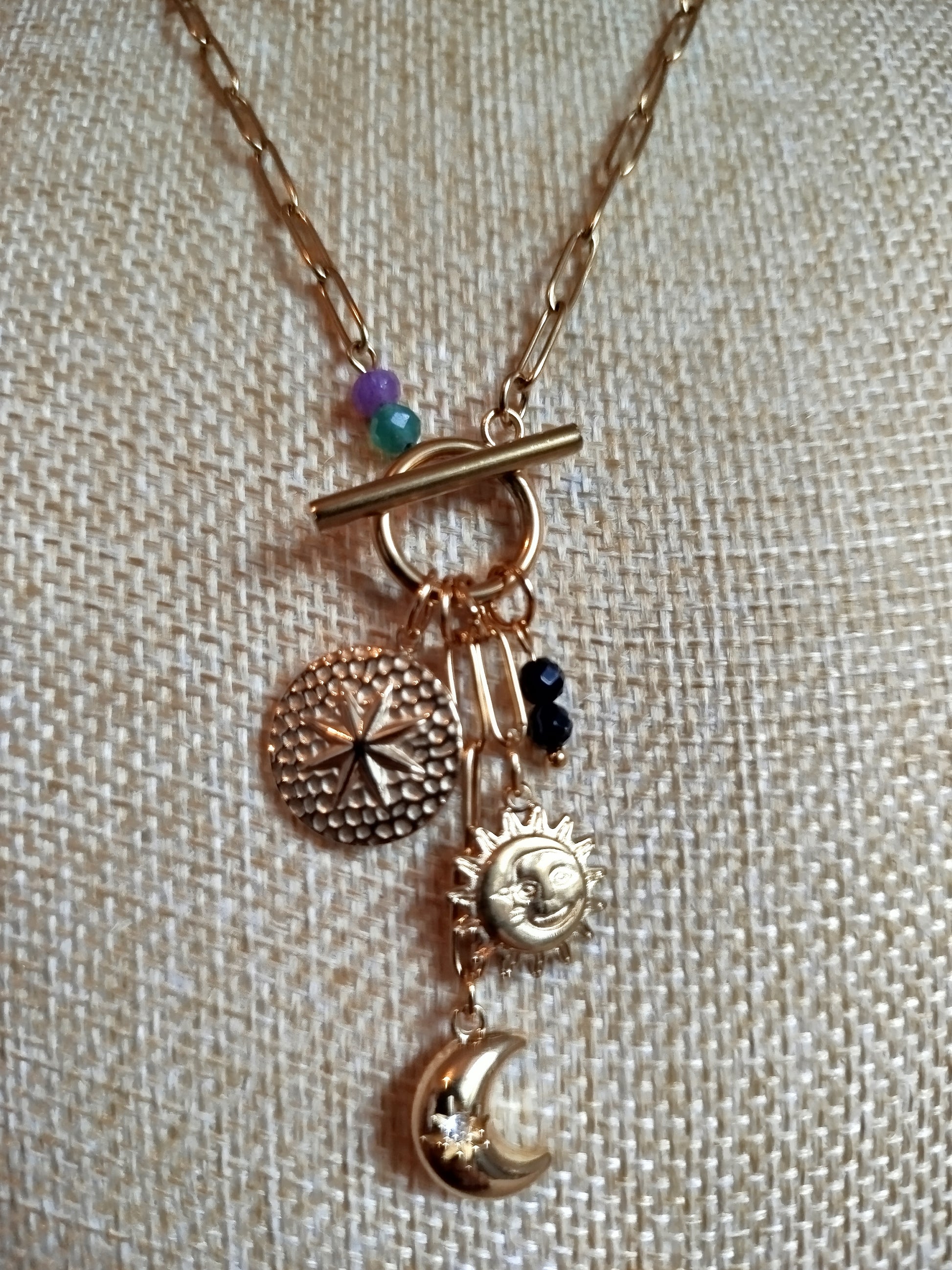 Découvrez ce magnifique collier Y en acier inoxydable doré, orné de délicates breloques lune et soleil. Son fermoir discret sur le devant ajoute une touche d'élégance à votre silhouette. Parfait pour exprimer votre personnalité et vos aspirations, ce bijou intemporel accompagne vos plus beaux moments avec grâce et raffinement.