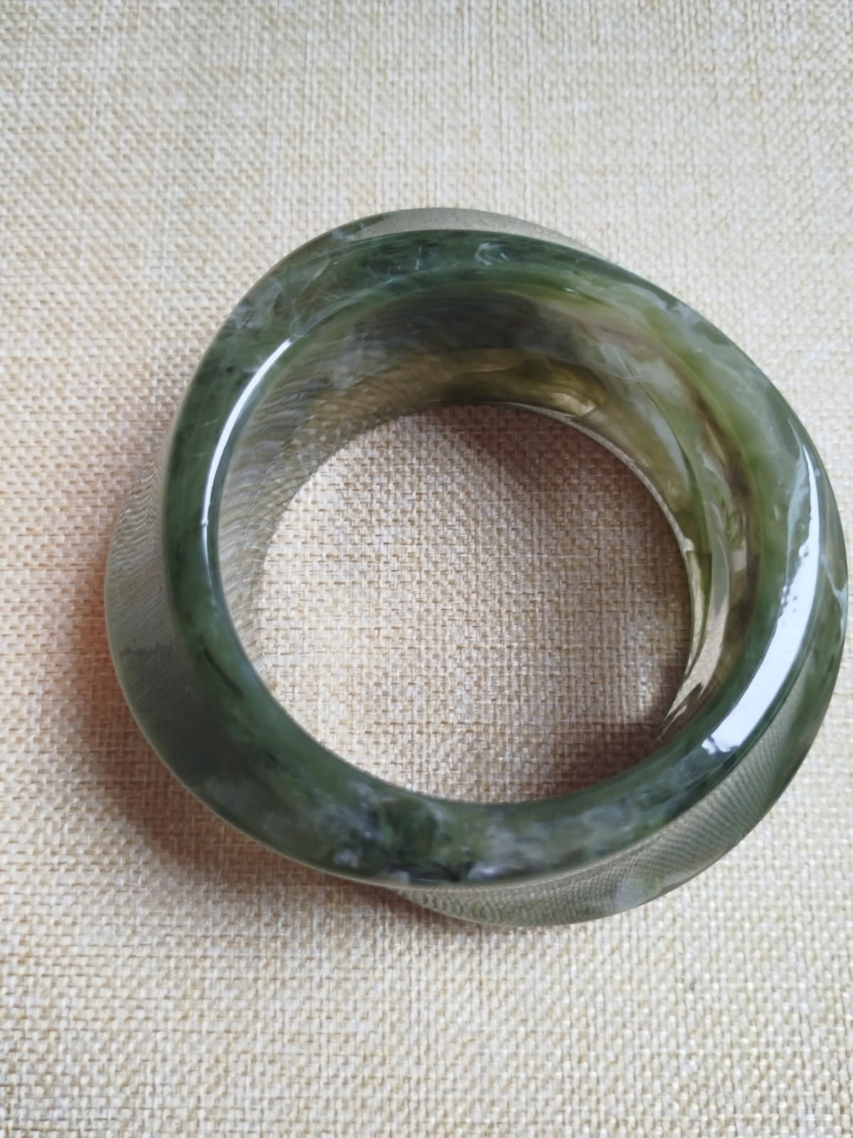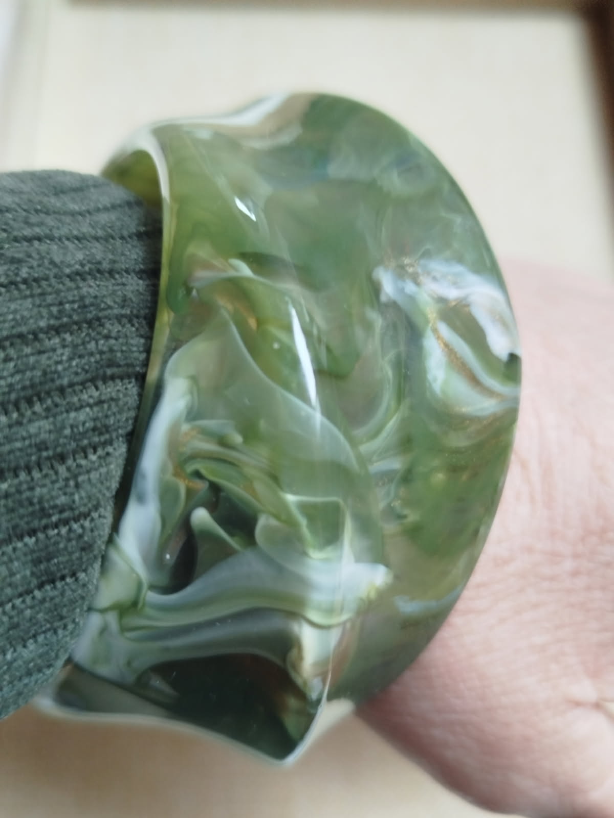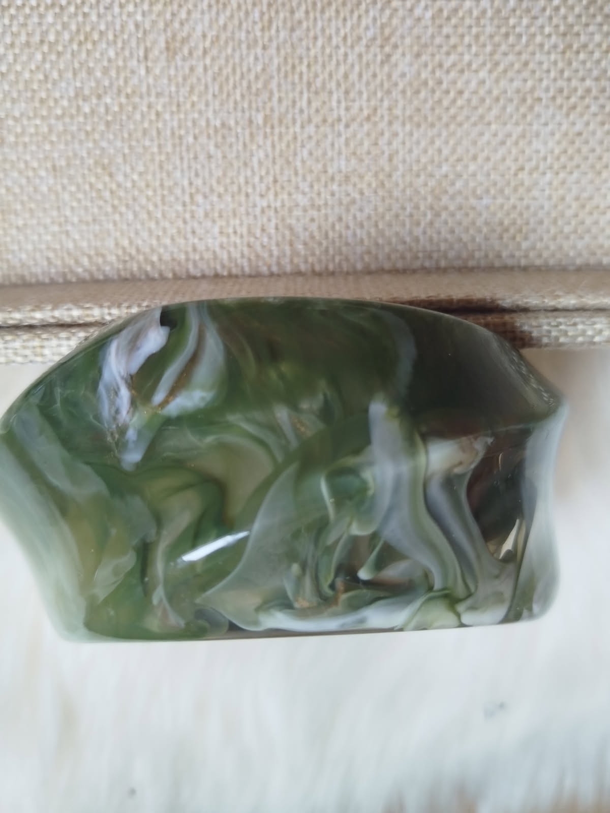 Bracelet rigide aux teintes chaleureuses kaki et de blanc, confectionné en résine. Avec un diamètre de 6,5 cm, ce jonc épousera délicatement votre poignet pour un style naturel et intemporel.