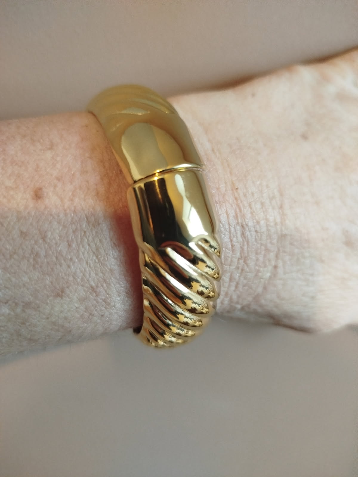 Découvrez ce jonc ajustable en acier inoxydable doré, orné de fines striures qui capturent la lumière avec élégance. Une création intemporelle qui s'adapte parfaitement à votre morphologie, pour un accessoire à la fois sophistiqué et confortable au quotidien.